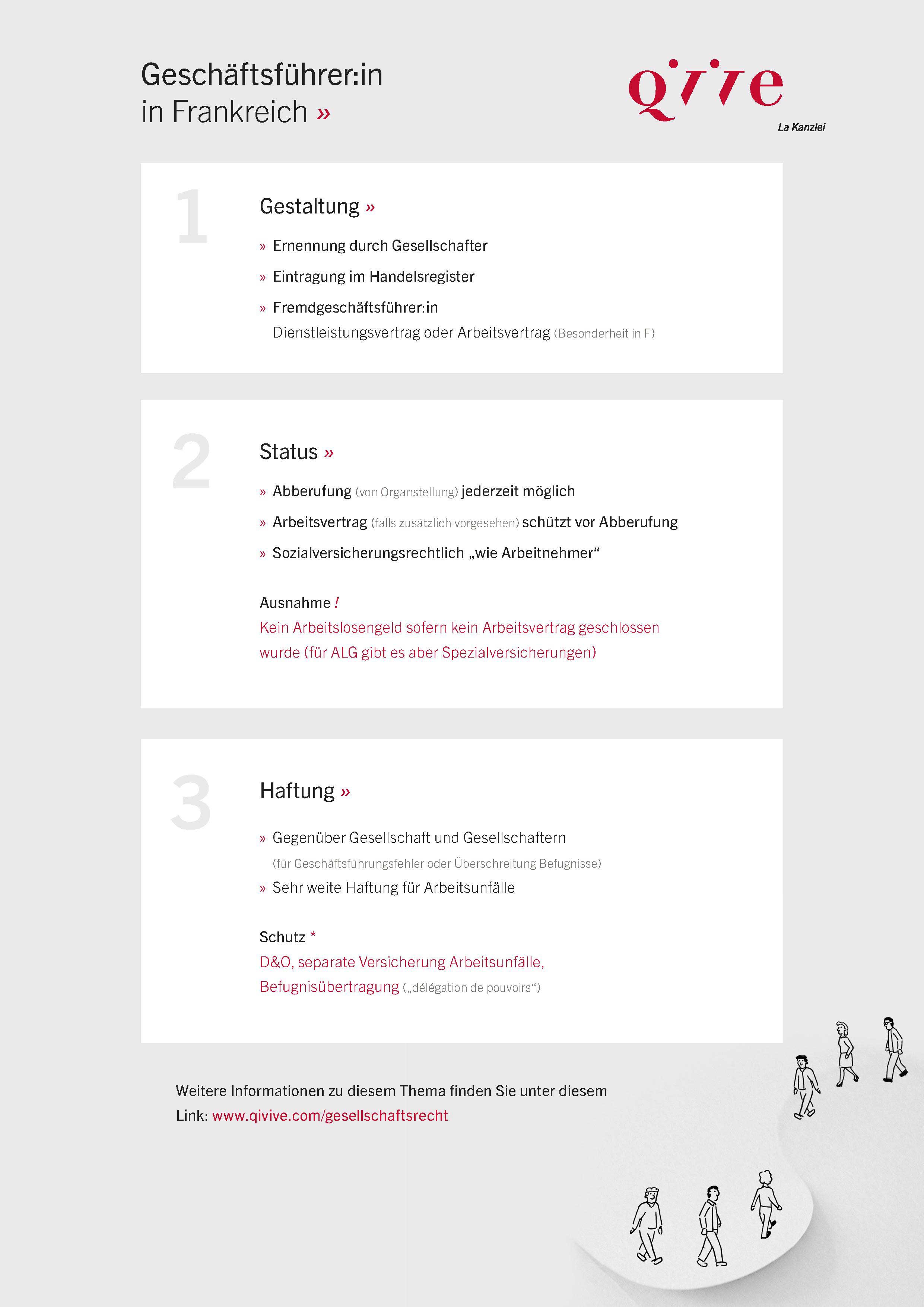 Nachstehend werden die wesentlichen Regeln nur für die Rechtsformen SARL und SAS abgebildet, um nicht den Rahmen zu sprengen. Soweit nicht anders angegeben wird der Einfachheit halber nachfolgend für beide Gesellschaftsformen der gesetzliche Vertreter als „Geschäftsführer“ bezeichnet.
